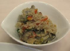 鍋に、椎茸・おから・長ねぎ・蓮根・人参を重ねる。だしを注ぎ、塩・みりんを加えて、ふたをして火にかける。沸騰したら弱火にし、20分煮る。
