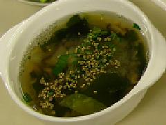 塩で味つけをし、5分煮る。醤油で味つけをし、さらに2〜3分煮る。わかめを加えて器に盛り、大根おろし・大葉・ごまを飾る。