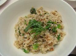 玄米ごはんを加え、絶えず混ぜながら炒める。梅干・醤油を混ぜ合わせたものを加え、さらに炒める。好みでこしょうをふり、器に盛る。