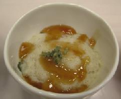 かぶら蒸しの上に、わさびを少しのせ、葛ソースを注ぐ。 |