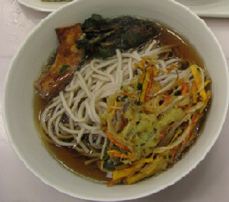 食べる前に麺を熱湯に通してつゆに入れても良いし、直接麺をつゆに入れても良い。薬味(長ねぎ・白いりごま)を添える。