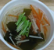 ビーフンを1のスープに入れ、少し温める。器に盛り、塩藏わかめ・水菜を添えて、七味唐辛子をふる。