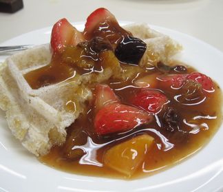 生の果物を加え、煮立たせる。(注:りんごなどの水気の少ない果物の場合。水気の多い柔らかい果物の場合は、葛を加えた後、または冷ましてから加える)かき混ぜながら少しずつ水溶き葛を加え、弱火で3分煮る。熱いまま、または冷ましてから出す。
