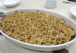 りんごを混ぜたものをオーブン皿に移す。りんごの上にクランチを均等にのせ、アルミホイルをかぶせる。 |